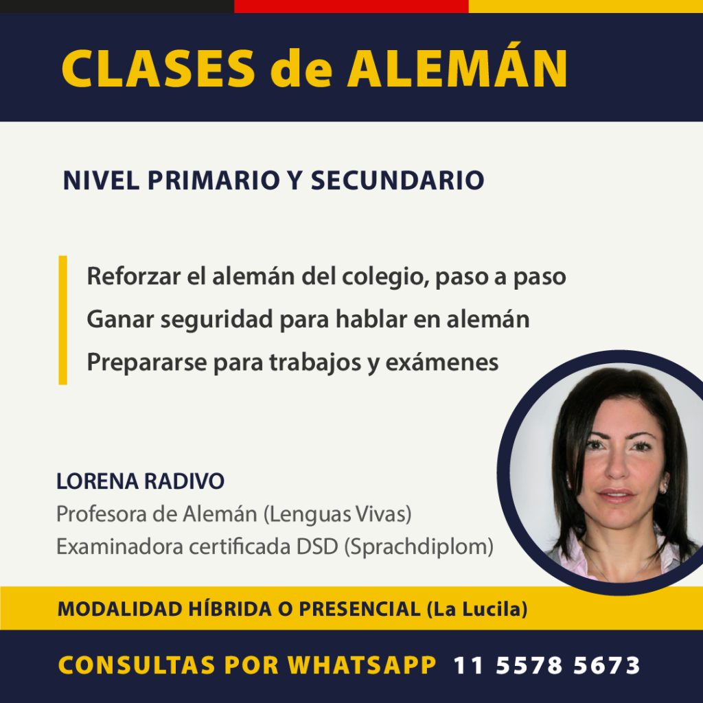 ¡Hola! Soy Lorena, profesora de alemán, hablante nativa y con experiencia docente en la Goethe Schule. Si tu hijo o hija necesita reforzar el alemán del colegio, ganar confianza para hablar o prepararse para exámenes, puedo ayudarlos. Clases en modalidad híbrida o presencial en La Lucila. Consultas por WhatsApp al 11 5578 5673.